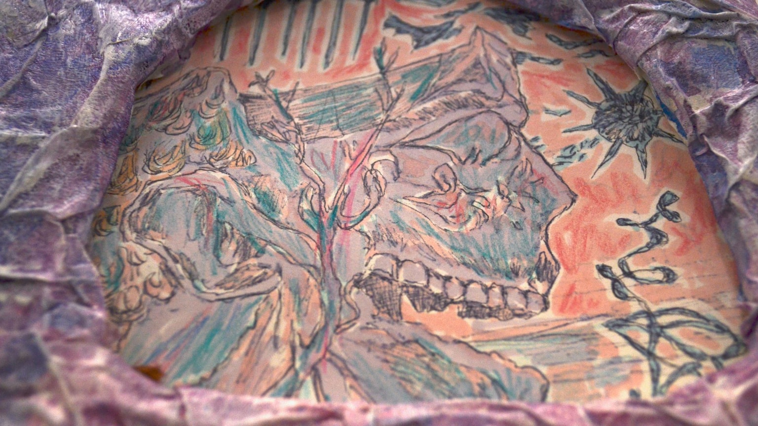 Ash Martin's dreamlike Biro drawings (rich with personal symbols, medieval marginalia, Skyrim fanart, and bubble-written poetry) chart a journey of liberation, self-mythology, and queer spiritual reimagining. These images are held within cartoonish papier-mache frames inspired by the architecture of churches and the Baroque frames of classical paintings.